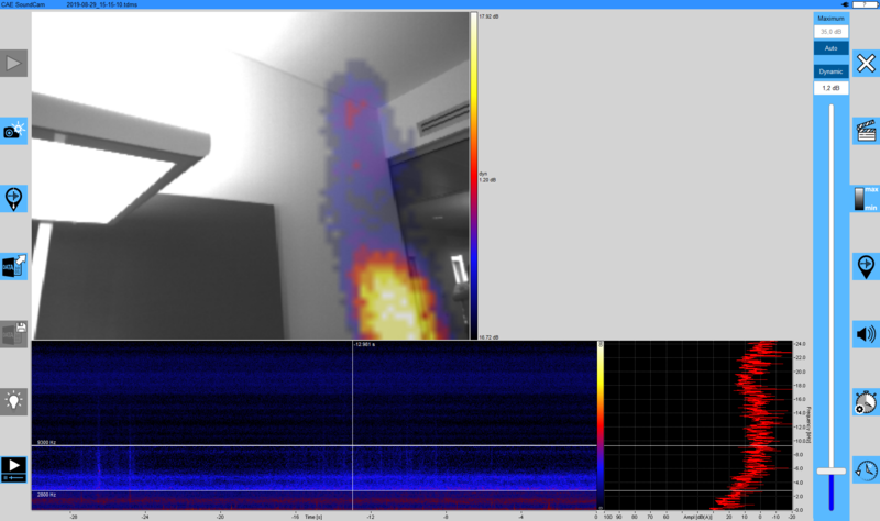 特に、後日設置された漆喰の仕切り壁は、音が不必要に部屋から部屋へと伝わる不適切な接続ポイントによってサウンドブリッジや漏れが発生するため、音響的に問題となることがよくあります。SoundCamを使用すると、これらのポイントを特定できるため、漏れに対して適切な対策を講じて除去することができます。動画では、隣の部屋からの音がどこで鳴り響いているのかをきっちりと見ることができます。仕切り壁の後ろの部屋には十二面体スピーカーを使用して刺激を与えました。