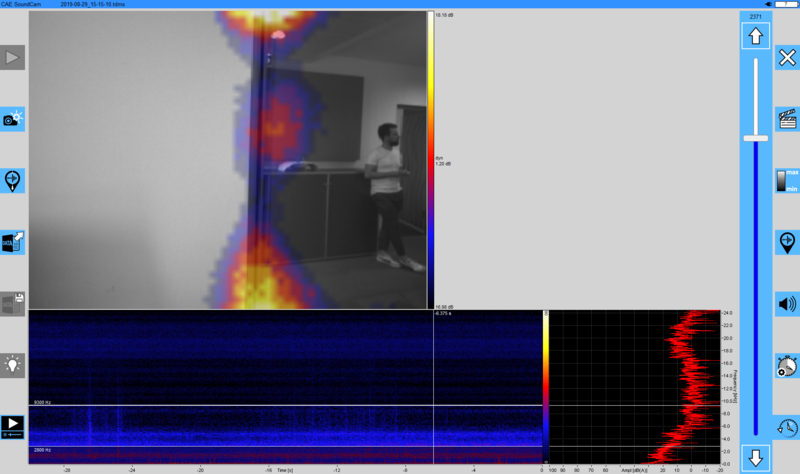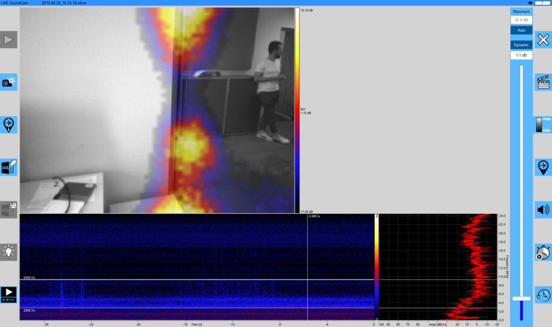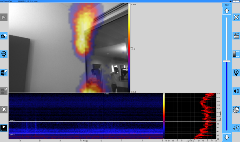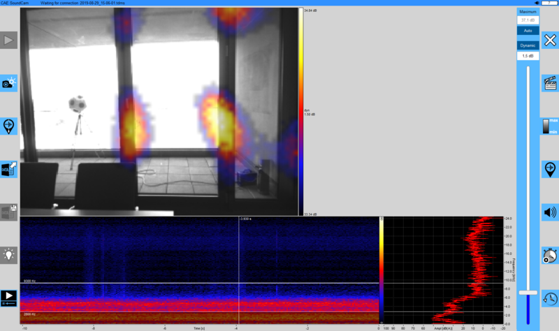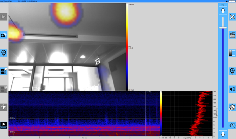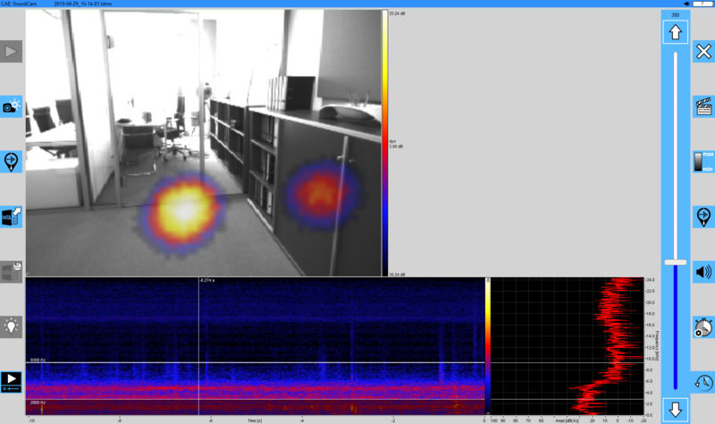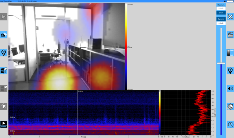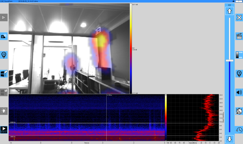 このさらなる例では、ガラス要素による部屋の分離が調査されています。ここでも、Soundcamで弱点がはっきりと認識できます。また、室内の音源の反射は、壁面ユニットや天井にも見えます。