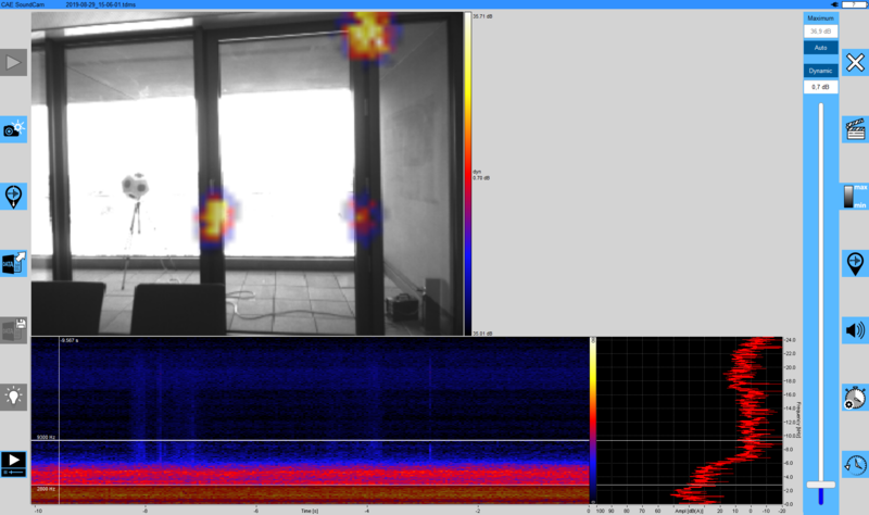 このビデオは、雨漏りのある窓の前面を示しています。SoundCamの助けを借りて、これらの漏れを可視化することができます。窓の正面の反対側、バルコニーには、ホワイトノイズを再生する十二面体スピーカーがあります。SoundCamは、漏れを通って部屋に入る音を表示するため、漏れを窓の前面に特定できます。