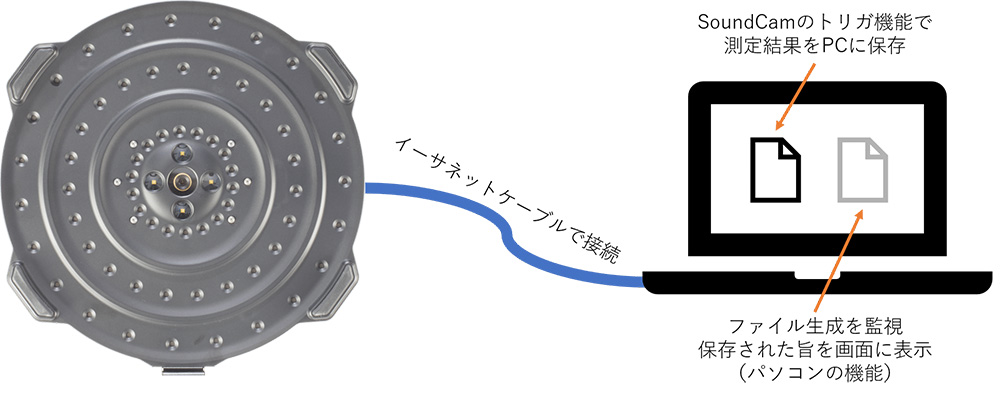 SoundCam 2.0SoundCam Ultra は音響カメラ単体で利用できる機器ですが、SoundCamとパソコンをイーサネットケーブルで接続し、パソコン用のアプリケーションを用いてSoundCamを操作することが可能です。安全上の問題から稼働中は近づくことが出来ない装置の測定を行う場合などはパソコンと接続しての利用がおすすめです。
