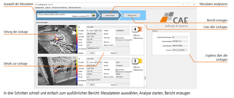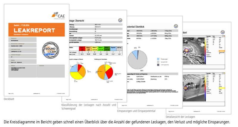 生成されたレポートは、エネルギー管理者がエネルギー管理の文書化に、保守技術者が修理に使用することができます。発見された漏れ、損失、および可能な節約について非常に優れた概要をすばやく提供します。