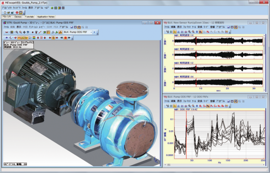 測定データに対してFFT,逆FFT,微分/積分, フィルタリング、算術演算などの波形処理をする機能です。ODS FRF(実稼動の位相付振幅)計算および複数回に分けて測定したODS FRFの振幅調整機能も含まれています。また、これらの後処理を行ったデータで、測定対象モデルの挙動をアニメーション表示することもできます。 更に、MIMOモデリング・シミュレーション、音響解析機能も含まれます。