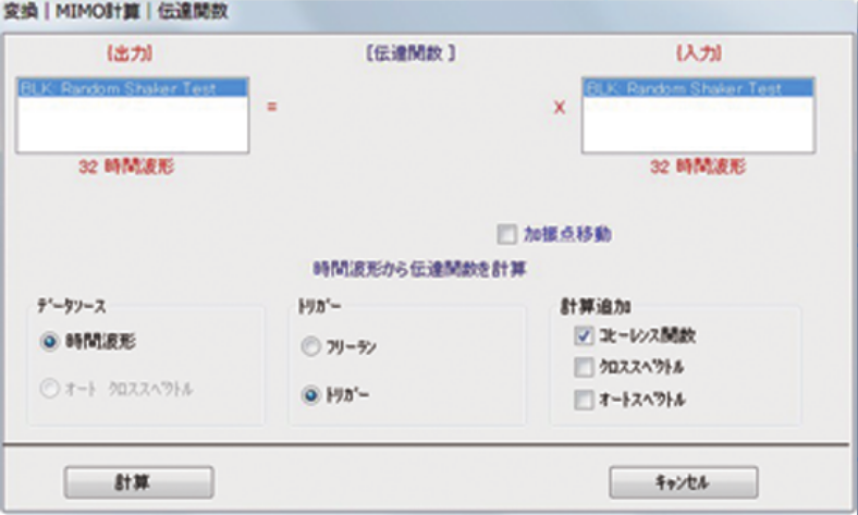 多点同時入力・多点応答の時刻暦波形から伝達関数を計算します。オートスペクトルとクロススペクトルから計算することも可能です。時間波形を使用する際には窓関数(Rectangular/Hanning /Flat Top)やアベレージング(ピークホールド、オーバーラップ)の設定が可能です。コヒーレンス関数も計算します。
