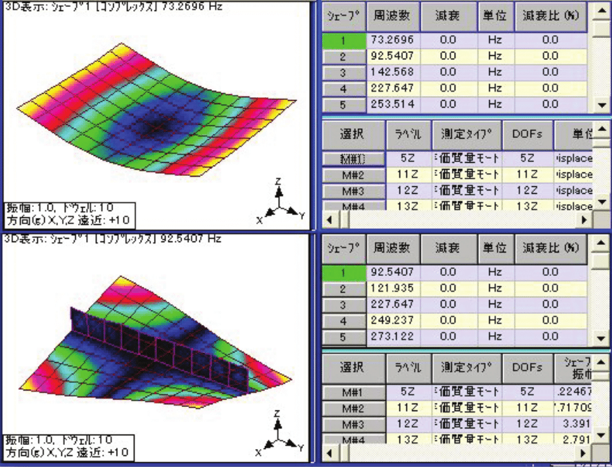 実験で得られたモードモデルに有限要素を追加してモードシェープを計算します。(有限要素はバネ、マス、ダンパー、バー、プレートなど)各要素の物性値はスプレッドシート上で編集できます。